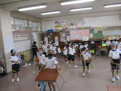 これまでファミリー清掃だったのですが、コロナ対策のため各学年清掃になりました。いつもは、上級生が重い机を運んでくれていたのですが、自分たちで運ばなくてはなりません。みんなで協力してがんばっています。