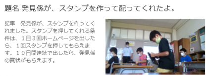 発見係が、スタンプを作ってくれました。スタンプを押してくれる条件は、1日3回ホームページを出したら、1回スタンプを押してもらえます。10日間連続で出したら、発見係の賞状がもらえます。