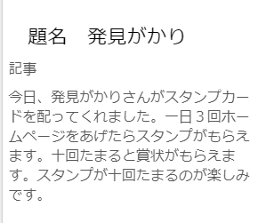 今日、発見がかりさんがスタンプカードを配ってくれました。一日3回ホームページをあげたらスタンプがもらえます。十回たまると賞状がもらえます。スタンプが十回たまるのが楽しみです。