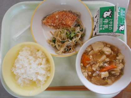 今日の献立は、ご飯、牛乳、鮭の唐揚げ、小松菜ともやしの香味和え、豆腐の野菜あんかけです。明日の献立は、ご飯、牛乳、鰯の生姜味、コーン和え、大根の味噌煮込み、冷凍パインです。
