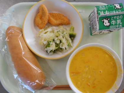 今日の献立は、コッペパン、牛乳、チキンナゲット、フレンチサラダ、かぼちゃポタージュです。明日の献立は、ご飯、牛乳、豚肉のキムチ炒め、きゅうりもみ、茎わかめスープ、バナナです。