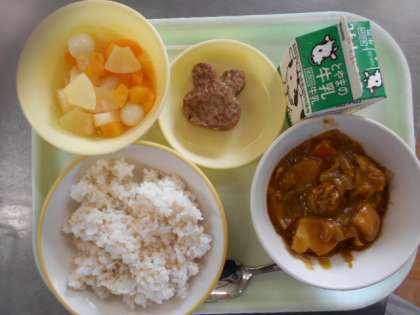 今日の献立は、十五夜ハンバーグカレーライス(麦ご飯)、牛乳、うさぎ型ハンバーグ、フルーツ白玉です。明日の献立は、ご飯、牛乳、揚げ出し豆腐のごまだれかけ、ゆかり和え、味噌汁です。