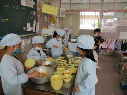 机の除菌、手洗いうがいを済ませ、給食当番は素早く準備に取りかかり、当番じゃない子供も配ぜんを静かに待っています。