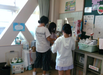 今日の大休憩に石鹸パトロールをしました。先週、南館をあまりできていなかったので結構減っていて大変でした。作った石鹸をペットボトルに入れる作業が1番大変でした。先生が新しい換気アイテムを作っていました。