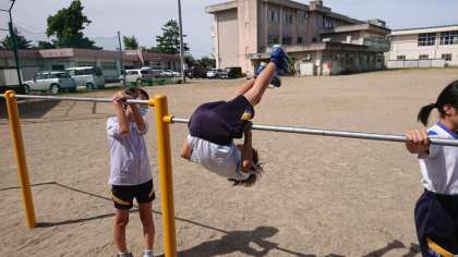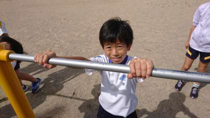 子供たちと鉄棒に取り組みました。思い思いの技にチャレンジする子供たちを見ていると、大鉄棒の方から「できたー!できたー!」という大きな声が聞こえてきました。駆け寄ってみると、「さかあがり」ができたことをうれしそうに報告してくれるA・Sさん。改めて技を見せてもらいます。身長ほどの高さのある大鉄棒で自分の足をふりあげ、きれいにくるんと回りました。「ほらね」と笑顔です。