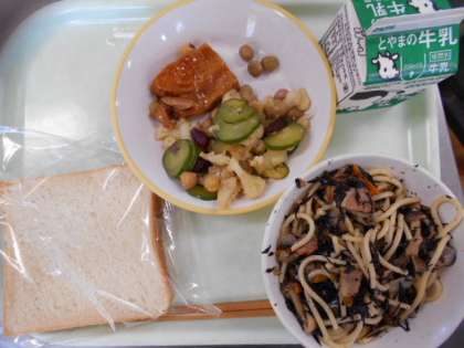 今日の献立は、食パン、牛乳、照り焼きチキン、ビーンズサラダ、ベーコンとひじきの和風スパゲッティです。明日の献立は、ご飯、牛乳、人参シューマイ、小松菜ひたし、八宝菜です。