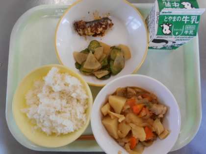 今日の献立は、ご飯、牛乳、鰯の土佐煮、華風和え、鶏肉とじゃがいもの旨煮です。来週月曜日の献立は、ご飯、牛乳、鯖のみりん焼き、おひたし、南蛮煮です。