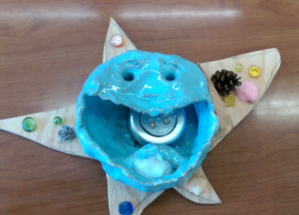 ワンプシェードの台をつくっています。台に色塗りをしたり、飾りをつけたりしました。