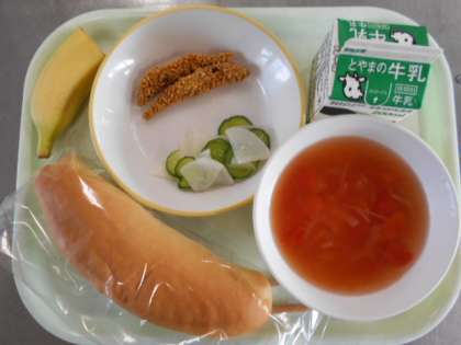 今日の献立は、米粉コッペパン、牛乳、きびなごのさくさく揚げ、カブのサラダ、トマトスープ、バナナです。明日の献立は、ご飯、牛乳、赤魚の塩焼き、卵とキクラゲの炒め物、炊き合わせです。
