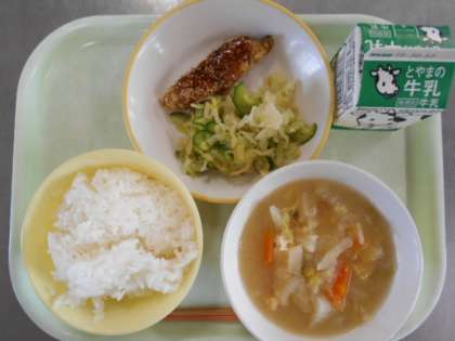 今日の献立は、ご飯、牛乳、ふくらぎのごまだれかけ、合わせ和え、五目味噌汁です。明日の献立は、食パン、牛乳、ミートボールのてりやき、れんこんソテー、卵コーンスープ、チョコレートクリームです。