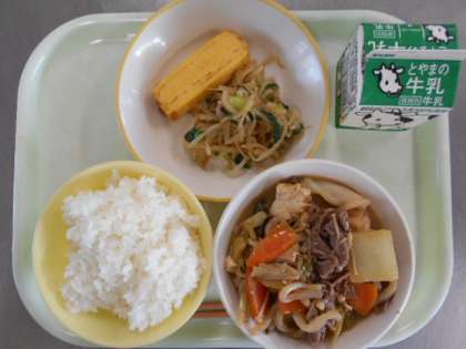 今日の献立は、ご飯、牛乳、厚焼き卵、おひたし、すき焼きです。明日の献立は、ご飯、牛乳、えごま入りかき揚げ、昆布和え、かしわうどん、しそかつおふりかけです。