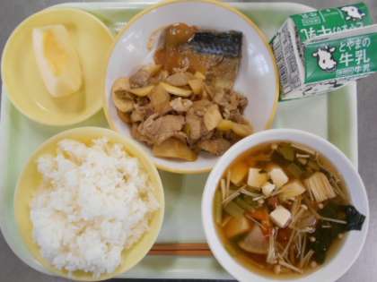 今日の献立は、ご飯、牛乳、鯖の味噌煮、マコモタケのオイスターソース炒め、きのこ汁、りんごです。明日の献立は、米粉コッペパン、牛乳、鱈の香草焼き、チーズおさつ、春雨スープです。