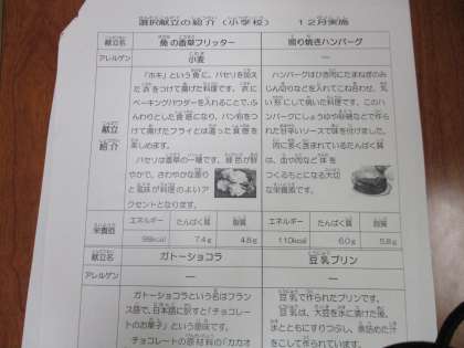 またまた選択献立が登場しました。選べるのは「魚の香草フリッター」と「照り焼きハンバーグ」、デザートは「ガトーショコラ」と「豆乳プリン」です。12月が待ち遠しいです。