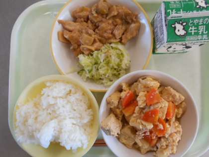 今日の献立は、ご飯、牛乳、あっさりチキン、茹でキャベツ、厚揚げの錦とじです。明日の献立は、ご飯、オレンジジュース、魚のフリッター、コーン和え、豆とソーセージのトマト煮です。