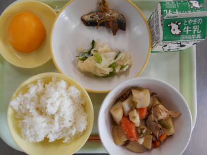 今日の献立は、ご飯、牛乳、鰯の生姜味、カブのいろどり、大根と鶏肉の旨煮、桃缶です。明日の献立は、ご飯、牛乳、小鯵の唐揚げ、ゴマ和え、さつま汁です。