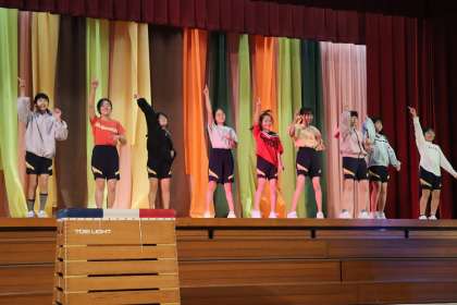 1,2年生は他学年が見ている中でも、笑顔を見せながら楽しそうに演技していました。発表中もたくさんの拍手をもらってうれしそうにしていました。