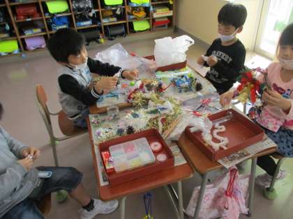 今日は、アサガオのリースに飾りつけをしました。秋の実を付けたり、リボンを付けたりして、素敵なリースに仕上げました。