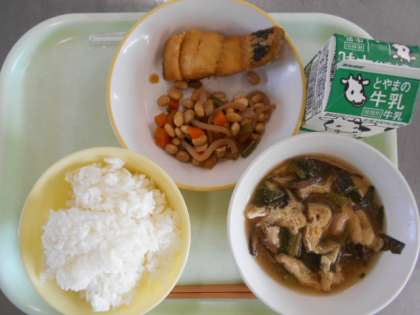 今日の献立は、ご飯、牛乳、揚げ魚のレモン味、五目煮豆、うすくず汁です。明日の献立は、ご飯、牛乳、わかさぎのフリッター、昆布和え、おでんです。