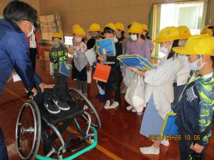 所長さんのお話を聞きながら、バスケットボールをするために工夫された車椅子を見たり、さわったりしました。普通の車椅子よりも軽いことに驚きながら、興味津々で話を聞いていました。
