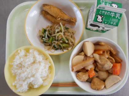 今日の献立は、ご飯、牛乳、わかさぎのフリッター、昆布和え、おでんです。明後日の献立は、ご飯、牛乳、卵ロール、フレンチサラダ、秋の香りシチューです。