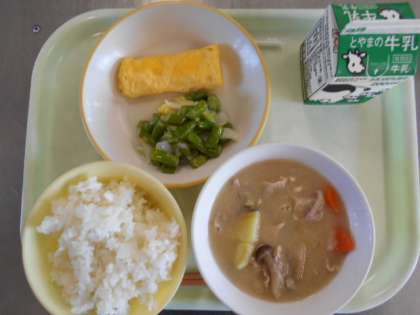今日の献立は、ご飯、牛乳、卵ロール、フレンチサラダ、秋のかおりシチューです。明日の献立は、ご飯、牛乳、白ネギハンバーグ、刻み和え、ぶりつみれ汁、りんごです。