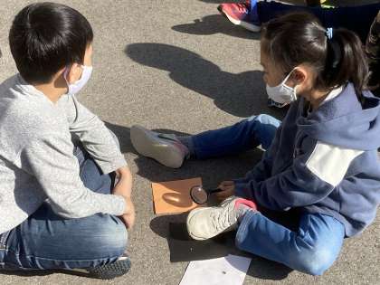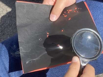 太陽の光を虫めがねで集めて紙をこがしたよ。でかい虫めがねでやると、あっという間に燃えたのでびっくりしたよ。 Y.I