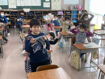 朝のスピーチに、ラジコンで動くキョウリュウを見せてくれました。どこが格好よいかと質問したら、歩くときに口の中が青く光るところだそうです。みんなが、「こんなラジコンがほしいね」と感想を言いました。 K.N