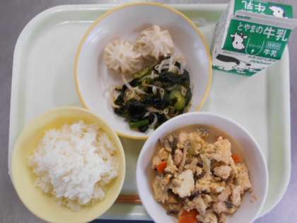 今日の献立は、ご飯、牛乳、えびパオツ、きゅうりとわかめの酢の物、炒り豆腐です。明日の献立は、ご飯、牛乳、鰆の塩焼き、しらたきのピリ辛炒め、白玉汁、カットパインです。