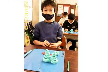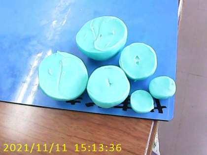 どこから見ても円に見える形を球ということを学習しました。粘土で球を作り、切り口の形や大きさを調べました。 釣り糸で粘土をすぱっと切ると、切り口が円の形になりました。みんな不思議そうでした。