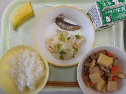 今日の献立は、ご飯、牛乳、いわしの梅煮、ゆず和え、豚肉の南蛮煮、バナナです。明後日の献立は、ご飯、牛乳、春巻き、華風和え、とんこつラーメン、大豆ふりかけです。