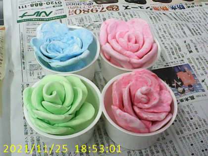 総合的な学習の時間に、3年生は、天瀬の森改造計画を進めています。みんながもっと気軽に立ち寄れるようにと、入り口に花の道を作ろうと考えています。試しに粘土でバラの花を作りました。今度は、学級のみんなで作る予定です。