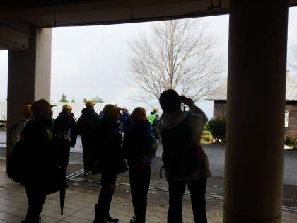 宿泊の日の朝は雨でした。バスの中や弁当をたべるときも。でも、宿泊棟ですごしているとき、晴れて日が照っていた。窓の外を見ると虹がうつった。山の中なのできれいだった。もっとすごかったのは、虹が山につながっていたところだ。みんな大声をだしてすごいと言っていた。自分も、夢をみているようで、思い出に残った。