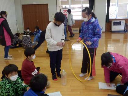 あまり天気がよくなかったので、外での活動はできませんでしたが、体育館のなかでいろいろな活動に取り組みました。班で楽しみながら活動していました。