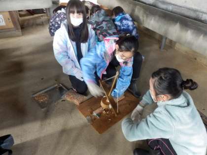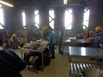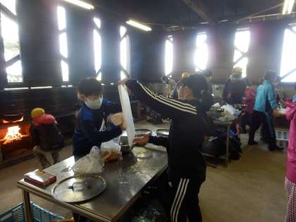 なかなかつきません、コツがいるようです。煙まではどのチームも上がりました。そしてカレーライス、野外炊飯です。