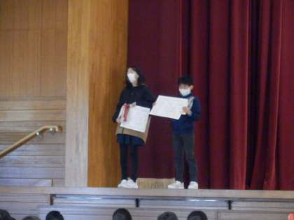 今日、集会の時、受賞伝達がありました。五年生だけでも五人いたのでびっくりしました。みんな上位にいたので、これからも五年生みんなで頑張っていきたいです。