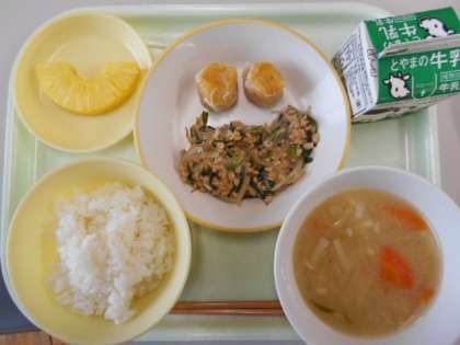 今日の献立は、ご飯、牛乳、人参シューマイ、スタミナ納豆、具沢山汁、カットパインです。明日の献立は、ご飯、牛乳、小鯵の唐揚げ、白菜ひたし、親子煮です。