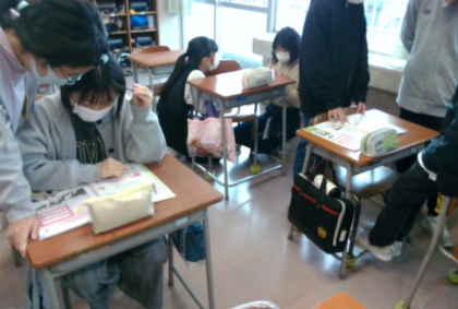 今日は、五分休憩の様子を紹介します。1時間目のあとに五分休憩の時に絵を書いたり今日ある英語のテストの勉強をしている人がたくさんいました。5分休憩を活用してテスト勉強をしていてすごいと思いました。私達も、テスト勉強をして本番を頑張りたいです。