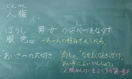 昨日、全校で人権集会をオンラインで行いました。生徒指導主事の先生の話や6年生代表の作文発表を聞き、3年教室では、挨拶のことや友達を「さん」付けで呼ぶこと、思いやりをもって人と接することに気を付けたいという意見が多く出ました。