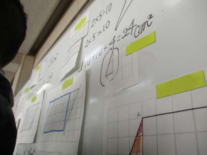 僕たちは算数の授業で面積の求め方を学習しています。今は平行四辺形です。いろいろな考えが出ていました。長方形に直したり、移動して合わせて形を変えたりして求めることができます。自分も考えを出せてよかったです。