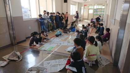 12月9日(木)の大休憩、ゲーム係さんが1年生と一緒にゲームをするプチ集会を行いました。1年生さんと新聞ゲームを行いました。わたしたち、HP係も参加したのですが、とっても楽しかったです。ゲーム係さんは、これからも他の学年と楽しむプチ集会を考えていくそうです。