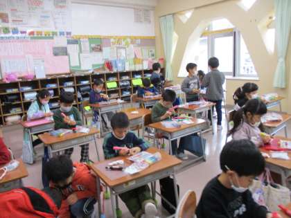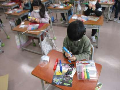 生活科の学習で昔からの遊びに挑戦しています。今日は、木製のこまに色づけをしました。回ると変化する様子を楽しみにしながらカラフルな模様を描きました。