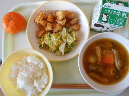 今日の献立は、ご飯、牛乳、魚と大豆のゆずソースからめ、あわせ和え、冬至の団子汁、みかんです。明日の献立は、ご飯、牛乳、小籠包、小松菜ひたし、海老と豆腐の旨煮です。