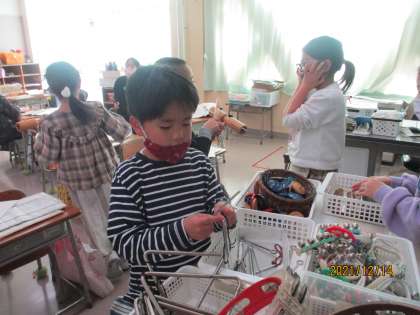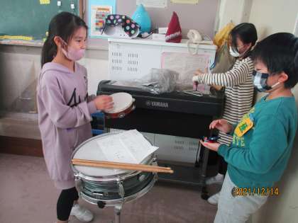 音楽の授業で、クラベス、すず、タンバリン、カスタネット、小太鼓等、様々な楽器を叩いたり鳴らしたりしながら、音色を楽しみました。子供たちは音を聴きながら、2分音符など長くのばす音をどの楽器にしようか悩んでいました。