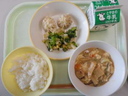 今日の献立は、ご飯、牛乳、小籠包、小松菜ひたし、海老と豆腐の旨煮です。明日の献立は、食パン、牛乳、豆とかぼちゃのコロッケ、カラフルサラダ、スパゲッティナポリタンです。