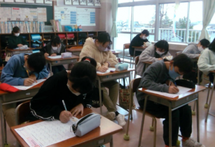 今日の1時間目に漢字テストをしました。漢字の50問テストでした。時間ギリギリまで勉強する人もいました。友達と点数で勝負する人もいました。皆、100点を目指して頑張っていました。
