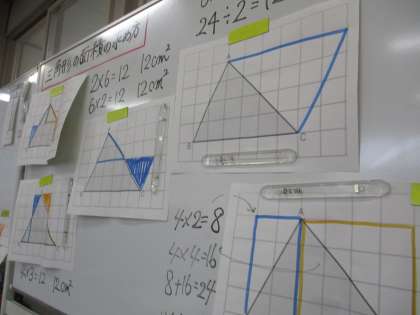 平行四辺形に続いて、三角形の面積を求めました。ある人は平行四辺形に変形させたり、またある人は長方形に直したりして面積を求めていました。僕も一つ考えを出すことができました。嬉しかったです。
