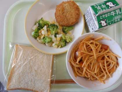 今日の献立は、食パン、牛乳、豆とかぼちゃのコロッケ、カラフルサラダ、スパゲッティナポリタンです。明日の献立は、ご飯、牛乳、鯖の銀紙焼き、かぶのいろどり、大豆の磯煮です。