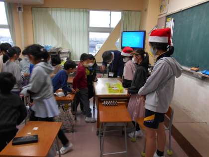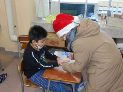 今日の大休憩に、1・3・5年生教室にスタンプサンタ(トナカイや雪だるまもいます)が、手洗いスタンプを持って現れました。一人一人スタンプサンタに、手洗いスタンプを手の平と手の甲に手洗いスタンプを押してもらいました。そのスタンプが落ちるようなていねいな手洗いをすると、おみくじが引けます。今日、おみくじを引いた人は何が当たりましたか?サンタ吉は紹介済みですが、来週行う学年は、楽しみにしていてくださいね。ちなみに天瀬っ子のデザインが採用されています。