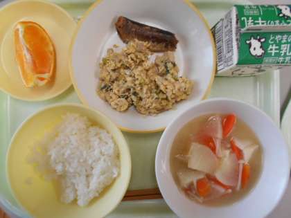 今日の献立は、ご飯、牛乳、鰯の梅煮、卵と青梗菜の炒め物、芋の子汁、あいかです。明日の献立は、ご飯、牛乳、鶏肉とレバーのねぎソース、茹でキャベツ、冬野菜のミネストローネです。