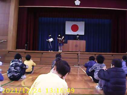 終業式の前に、賞状やメダルをもらっている人たちがいました。学校の外でもがんばっている子供で、よい成績をおさめた人が全校の前で紹介されました。わたしもがんばろうと思いました。 K.N
